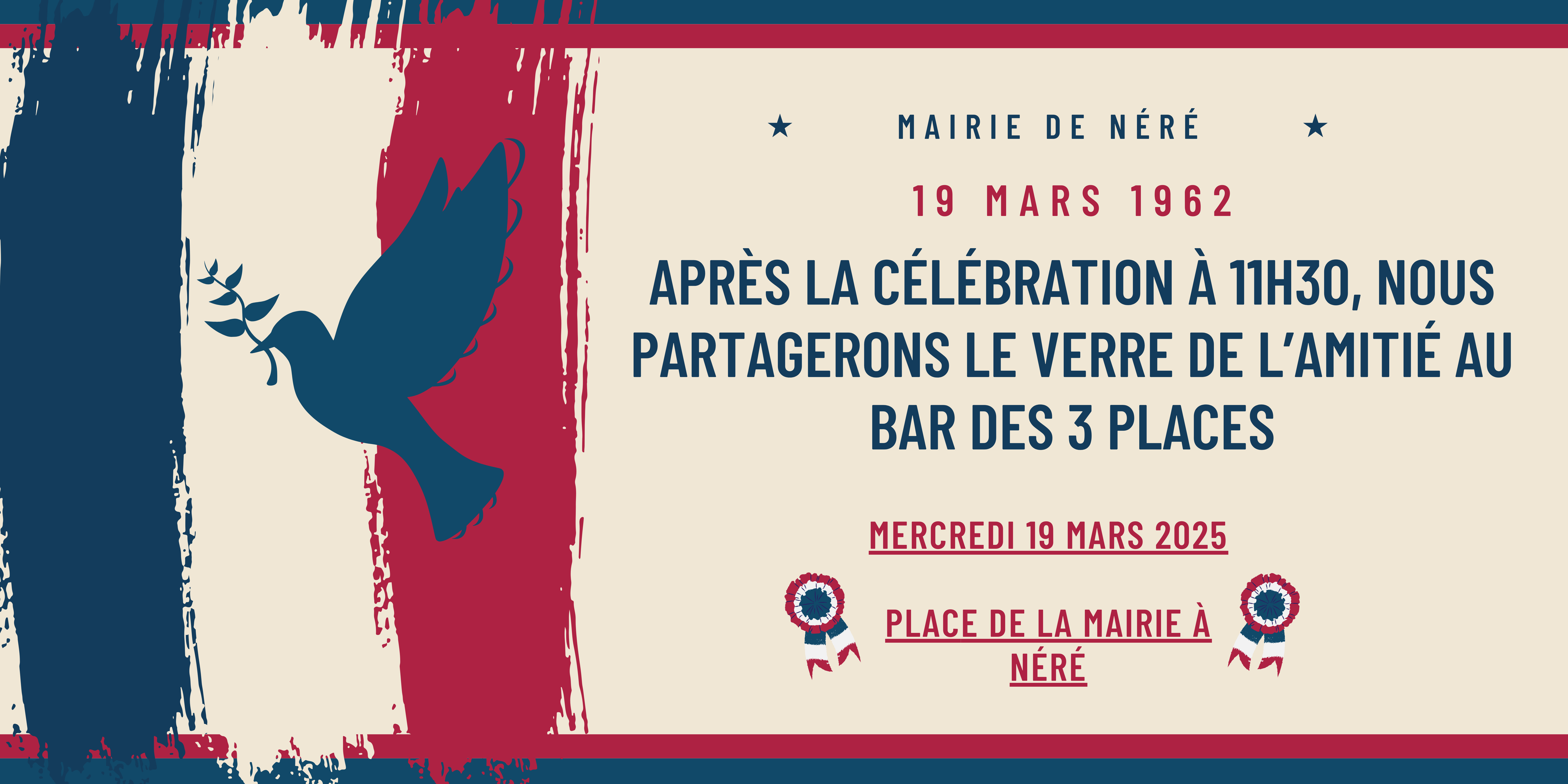 INVITATION : Vous êtes conviés à la cérémonie de commémoration du 19 mars 1962. Celle-ci s’organisera sur la Place de la Mairie le mercredi 19 mars 2025 à 11h30.