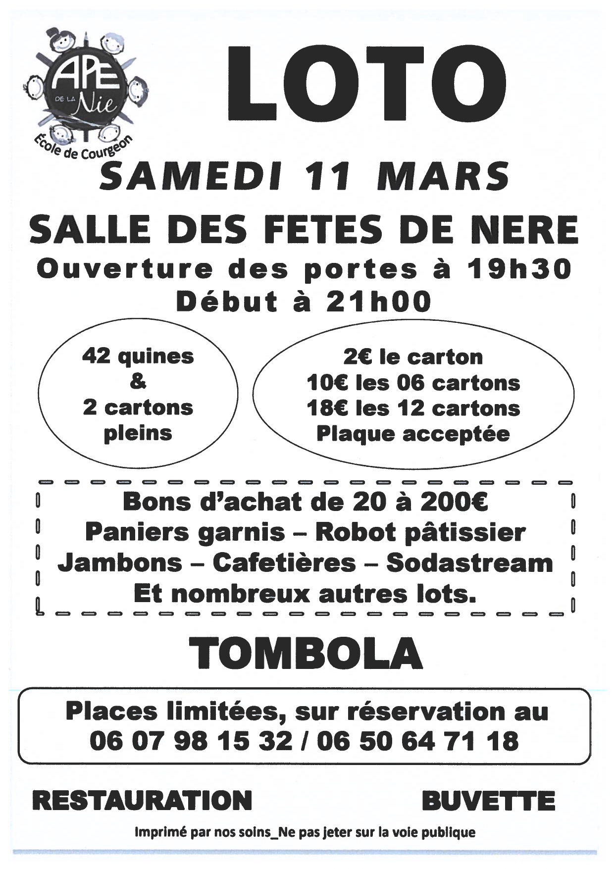 LOTO APE DE LA NIE + Ajouter à mon Agenda Google + iCal / Outlook export Date 11 Mar 2023 Expiré ! Heure 19:30 - 00:00 Partagez cet événement décembre 2025 Déc 17 2025 FÊTE DE NOËL Place de la Mairie Pas d'événement actuellement programmé.
